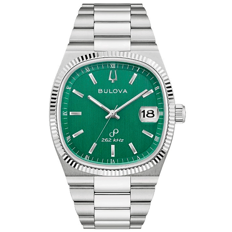 O mostrador verde escovado vertical exibe índices e ponteiros prateados polidos, além de janela de data às 3 horas sob lupa. A luneta com borda de moeda, o cristal de safira e o movimento Precisionist garantem sofisticação e desempenho, oferecendo precisão de segundos por ano e ponteiro de segundos com movimento contínuo. Index e ponteiros de hora e minutos com luminosidade completam o conjunto.
